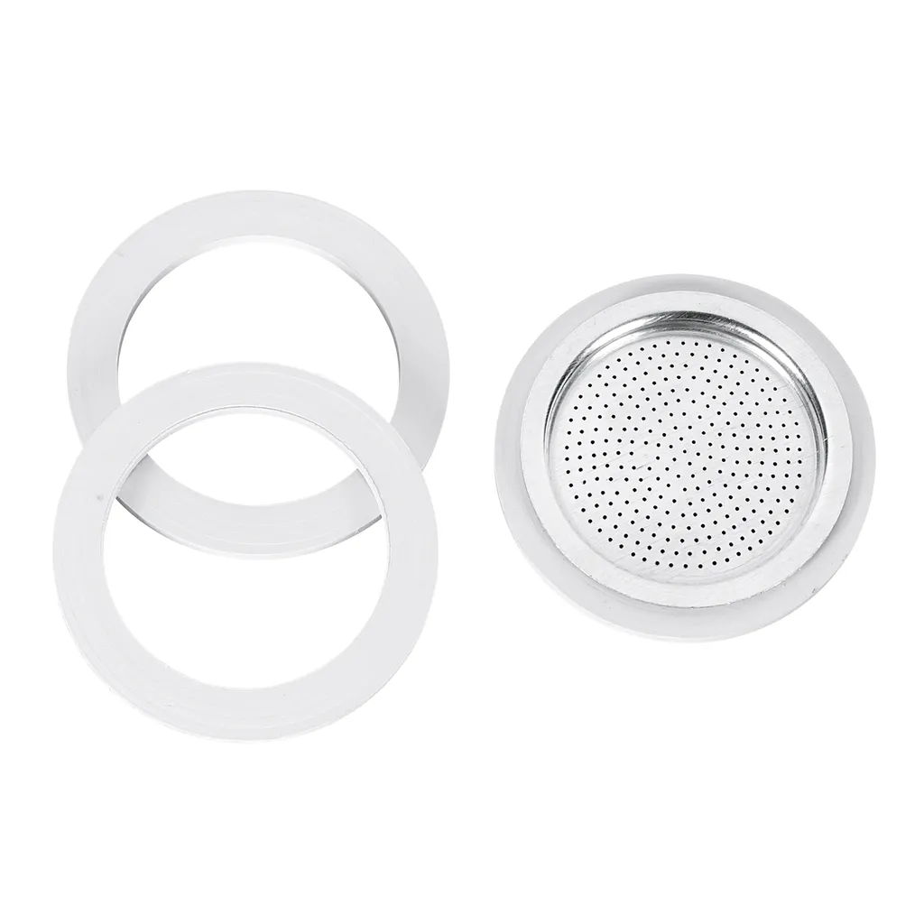 Drei Dichtungsringe und ein Kaffeesieb für die Moka Express von Bialetti.