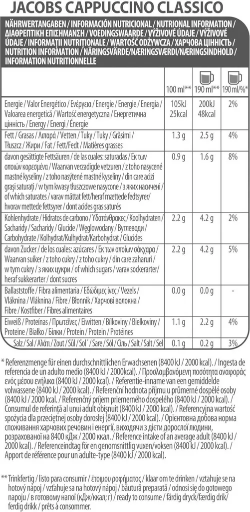 - Zutaten: Zucker (40%), MAGERMILCHPULVER (20%), VOLLMILCHPULVER, fettarmes Kakaopulver (8,5%), löslicher Bohnenkaffee (6,5%), Glukosesirup, Süßmolkenpulver (aus MILCH), Kokosfett (ganz gehärtet), Salz, MILCHPROTEINE, Stabilisator (E340), Trennmittel (E551), Emulgatoren (E433, E471, SOJALECITHIN)