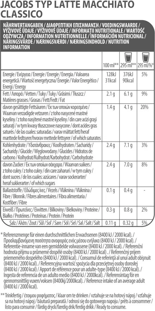 - Zutaten: Ultrafiltriertes Vollmilchkonzentrat (60%), gemahlener Röstkaffee (20%), Zucker (11%), Wasser, Salz, Säureregulator (E339).