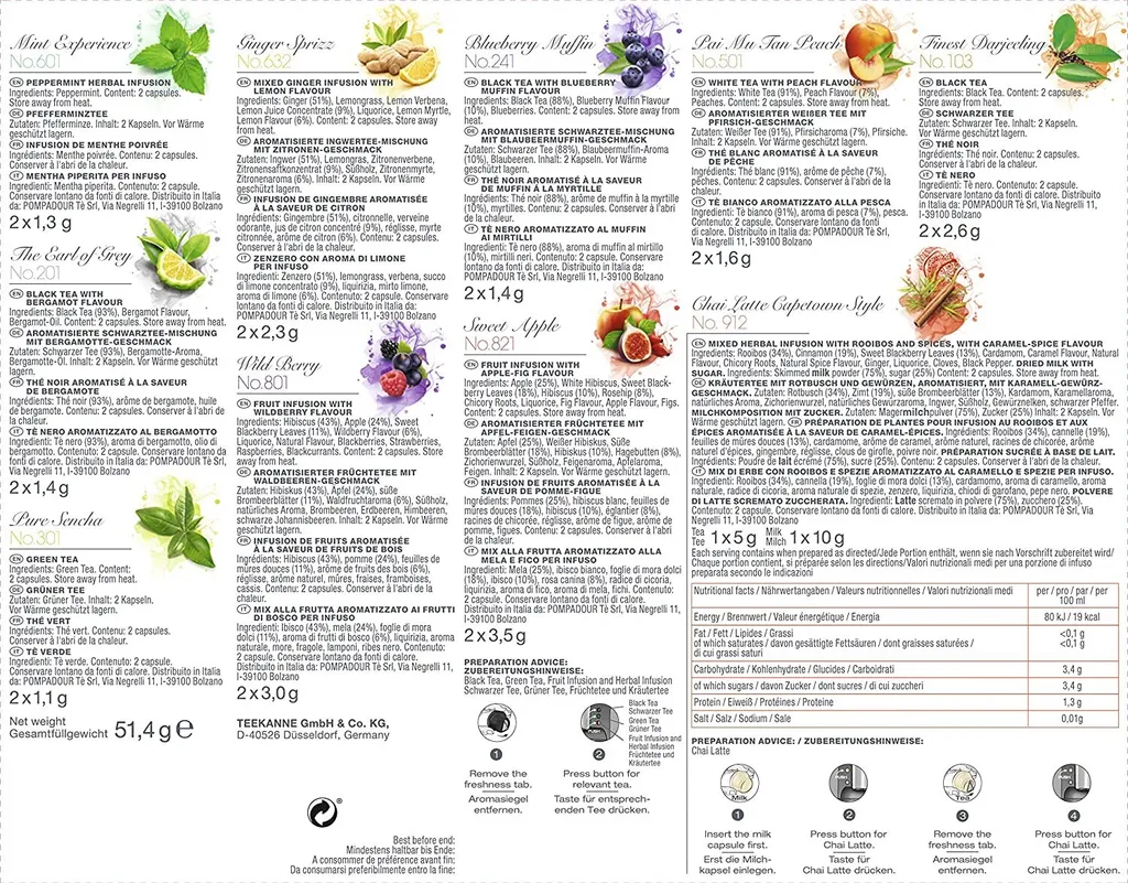 Das Starterset besteht aus einer TEEKANNE TEALOUNGE System Teekapselmaschine sowie einer Selection-Box mit 20 TEEKANNE Kapseln. Inhalt der Selection-Box: Jeweils 2 Kapseln Mint Experience, Ginger Sprizz, Blueberry Muffin, Wild Berry, Sweet Apple, Finest Darjeeling, The Earl of Grey, Pure Sencha, Pai Mu Tan Peach und Rooibos Vanilla Cookie. Das Starterset enthält außerdem 1 Wasserfilter und 2 Reinigungskapseln.